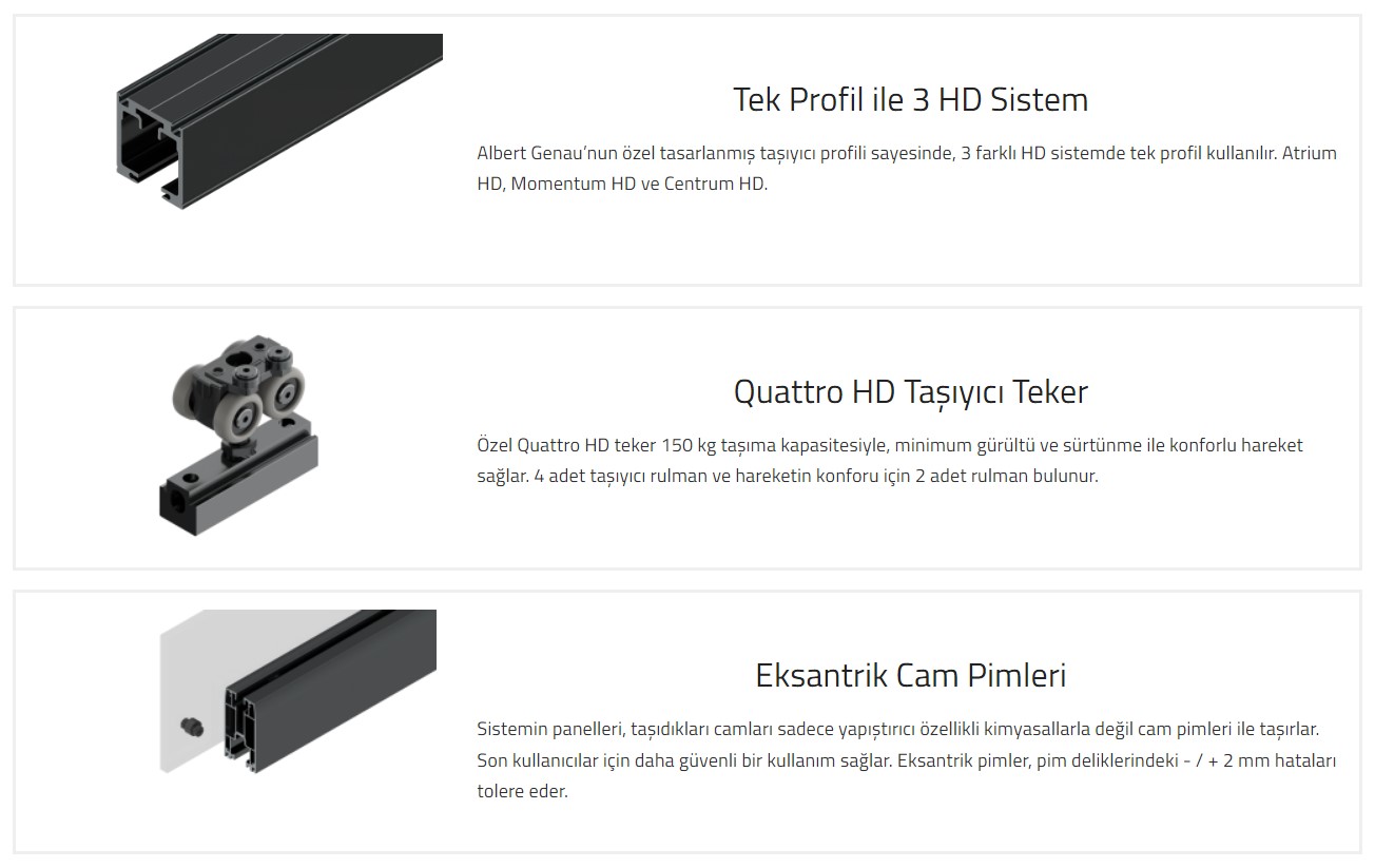 Albert Genau, yaşam alanlarınız için Hareketli Cam Sistemleri ile estetik ve esnek çözümler sunar. Kayar paneller zemin kılavuzları veya kanallar kullanılmadan hareket ettirilebilir. Tekerler, pimler ve kilitler her paneli sabit konumda durmasına yardımcı olur. Panellerin ayarlanması, hizalanması ve çalıştırılması kolaydır. Güçlü teker tasarımı sayesinde kullanımı kolaylaştırılmıştır.