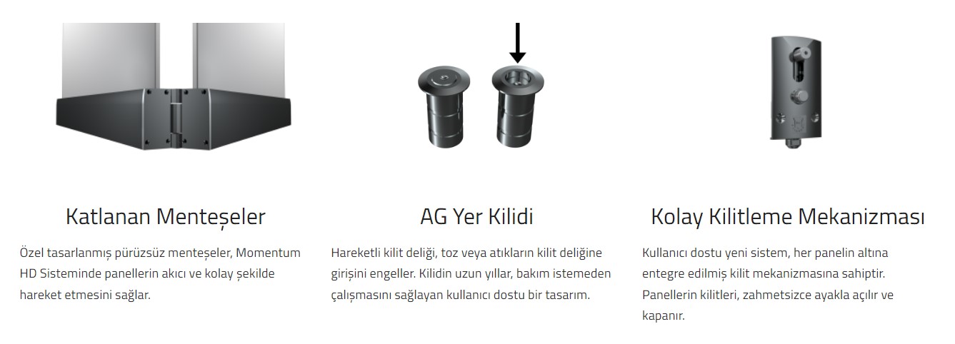 Hareketli Cam Sistemlerinden Momentum, Senktronize Katlanır Sistem olarak adlandırılır. Paneller sadece üstten tek noktadan sisteme ve birbirlerine bağlıdır. Paneller, yatay hareketi aynı anda menteşelerinden katlanarak gerçekleştirir. Paneller toplandıkları tarafta sisteme dik bir şeklide konumlanır.
